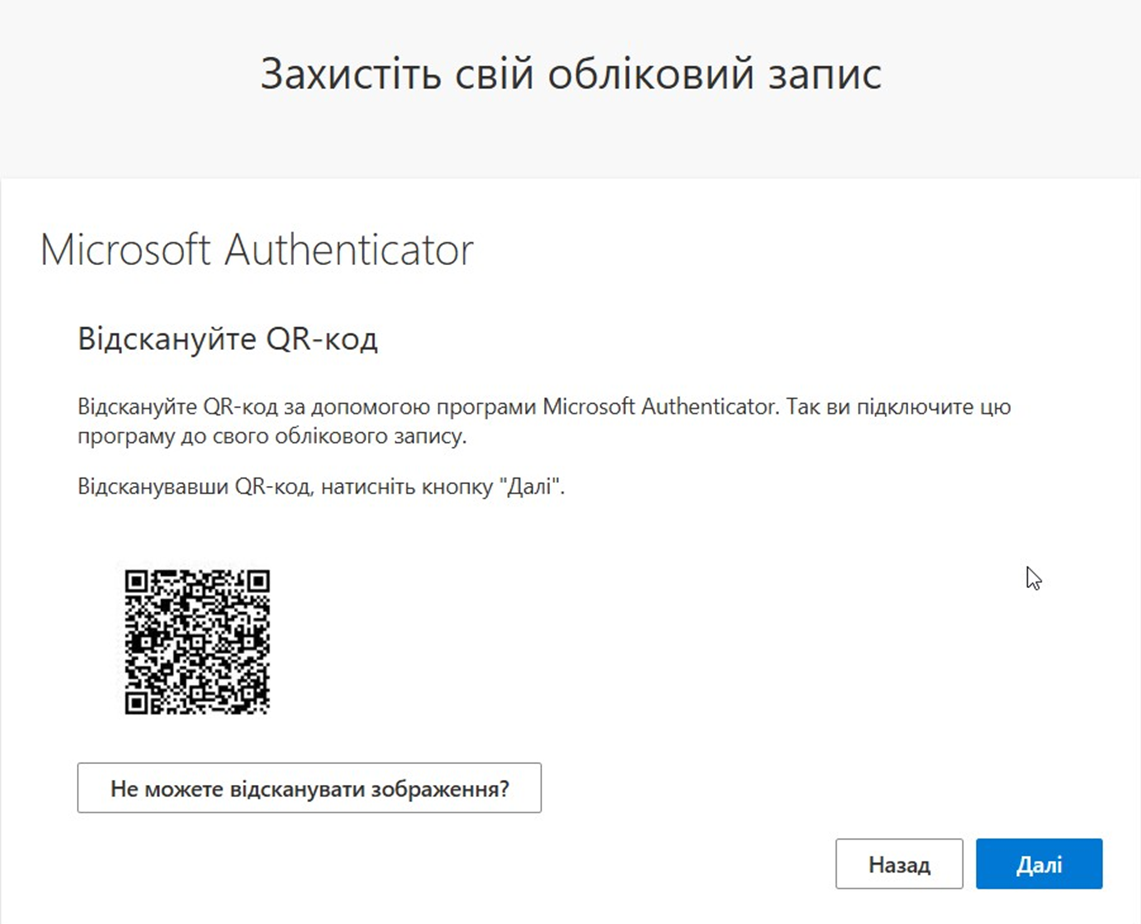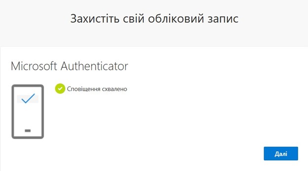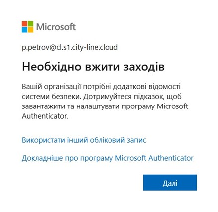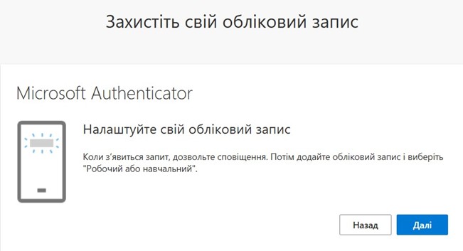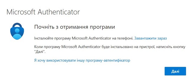 4. перед тим як натиснути «Далі» необхідно встановити та відкрити мобільний застосунок Microsoft Authenticator. Покликання на офіційний магазин під кожну мобільну платформу зазначено нижче: